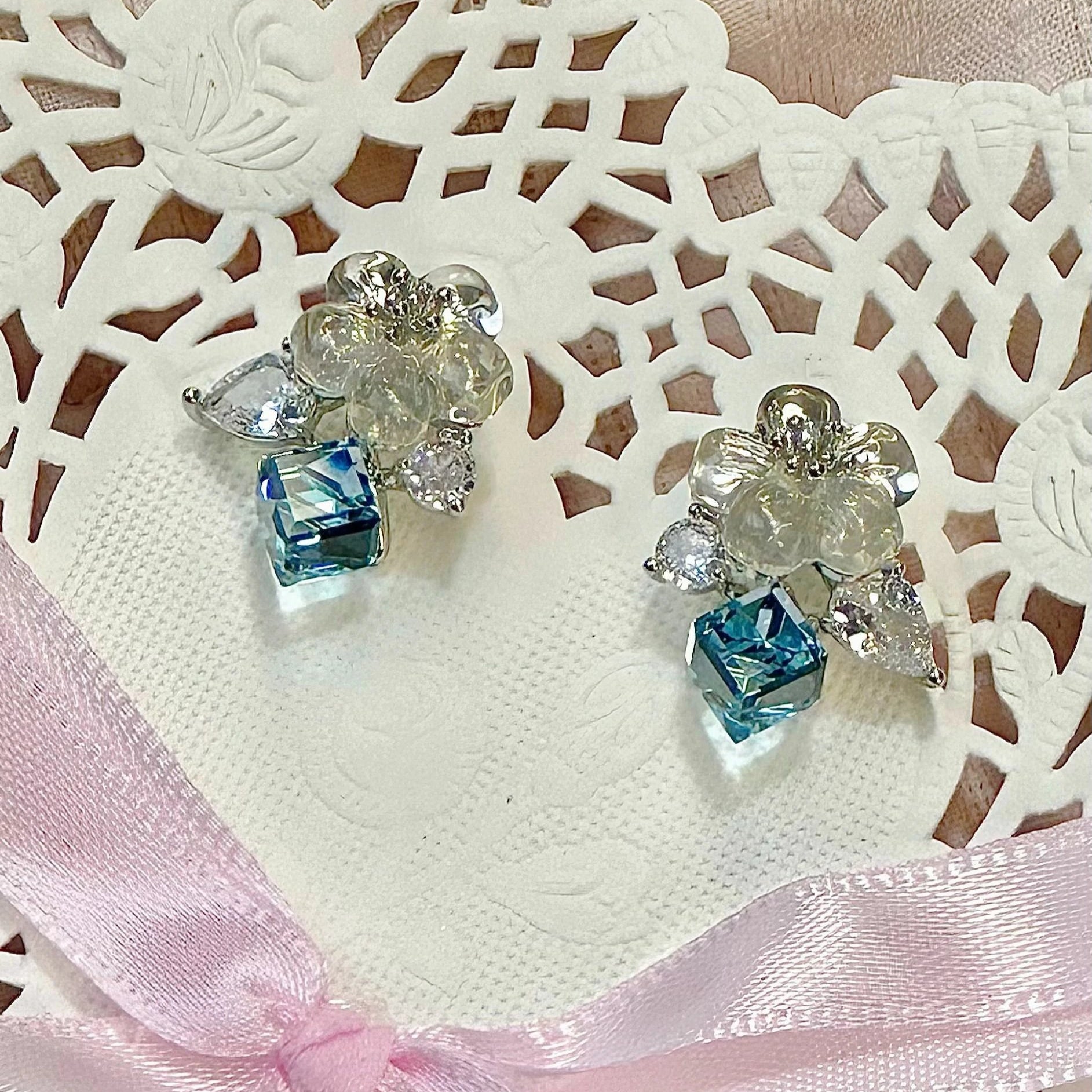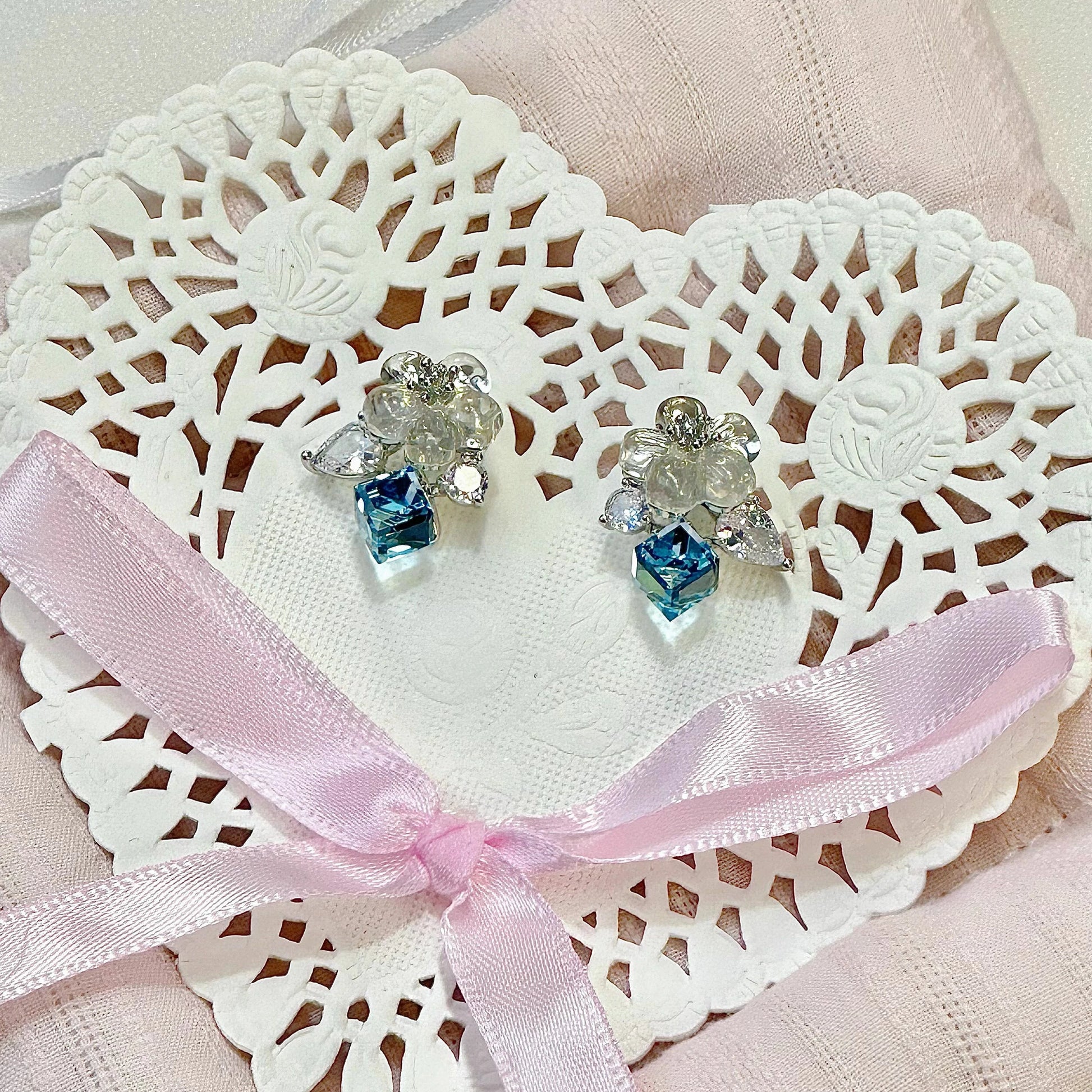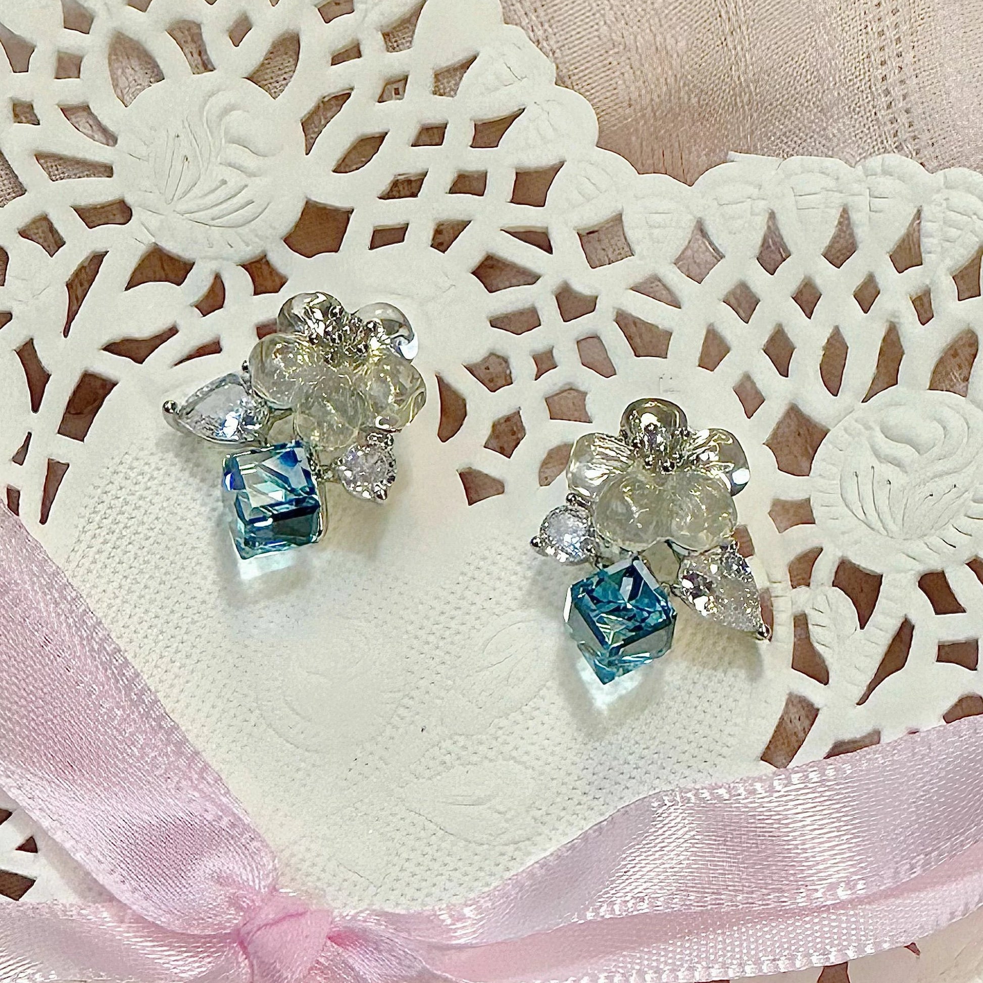 NaNa Boss | Blue Blossom Dream Earrings – Spring/Summer S925 Silver Studs with Crystal Cubes